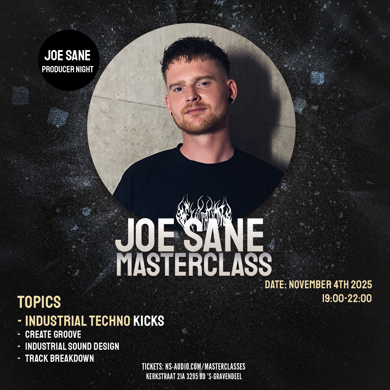 His music remains true to the raw, gritty essence of industrial techno, setting him apart from mainstream trends by adding his own distinctive twist to the sound. JOE SANE has also performed at events such as Rotterdam Rave, Verknipt, Club Basis, and has played extensively abroad over the past year, showcasing his powerful sound to an international audience.