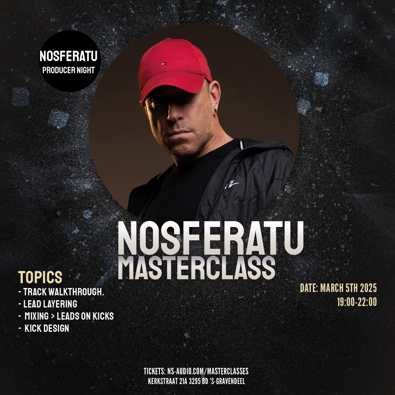 Get ready for an epic night of beats and good vibes! We’re thrilled to announce our producers night by Nosferatu happening on March 5th, 2025 from 19:00-22:00. (IT IS NOT POSSIBLE TO JOIN ONLINE, ONLY PHYSICAL IN THE STUDIO! MASTERCLASS IS IN DUTCH)